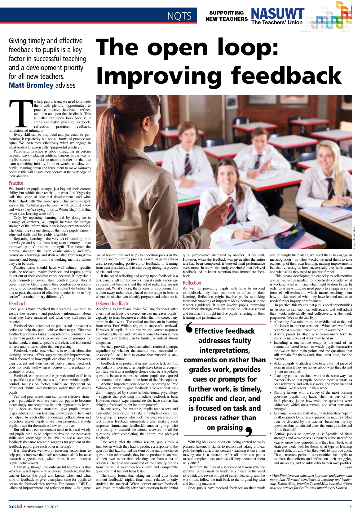 Another important consideration, according to Prof Wiliam, is when to give feedback. Conventional wisdom – supported by studies in behavioural psychology – suggests that providing immediate feedback is best. However, recent experimental results have shown that delaying feedback might be more powerful.