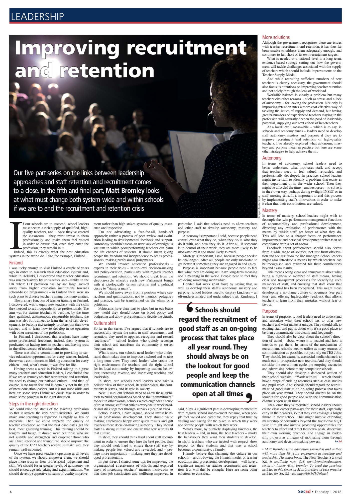 Having spent a week in Finland talking to a great many teachers and education leaders, I concluded that if we are to remedy teacher recruitment and retention, we need to change our national culture – and that, of course, is no mean feat and is certainly not in the gift of mere education leaders. But it is not impossible and here are some steps I think we could take in order to make some progress in the right direction.