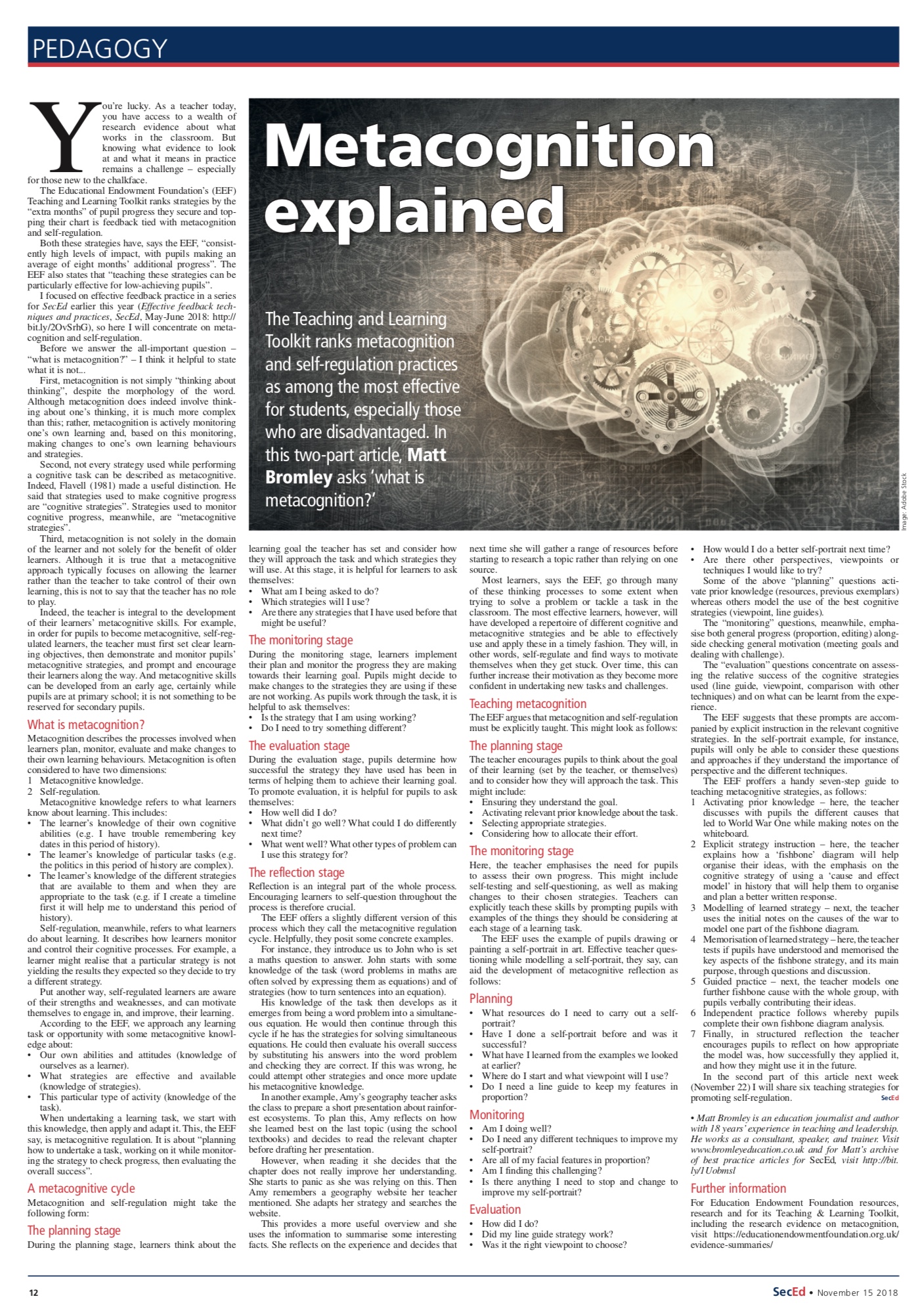I focused on effective feedback practice in a series for SecEd earlier this year (Effective feedback techniques and practices, SecEd, May-June 2018: http://bit.ly/2OvSrhG), so here I will concentrate on metacognition and self-regulation.