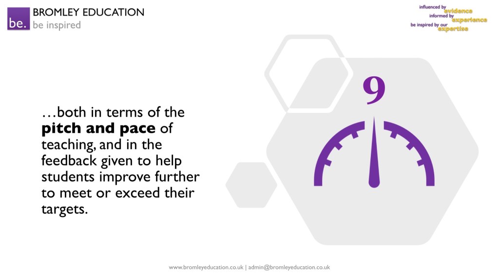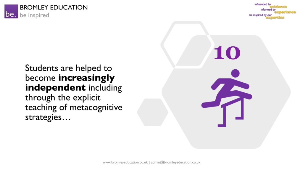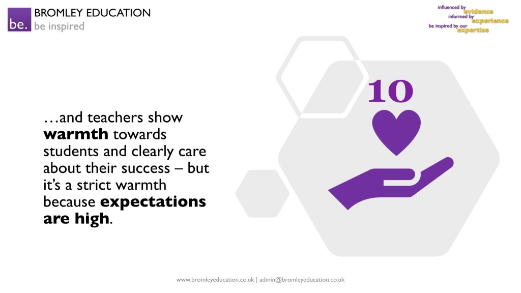 The tenth feature is that expert teachers show warmth towards students and clearly care about their success – which is rewarded by loyalty and hard work. Expectations of students are high, both academically and in terms of attitudes to learning; study skills are explicitly taught and applied in lessons.