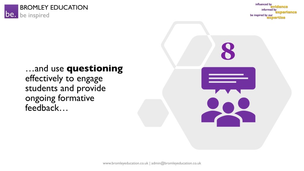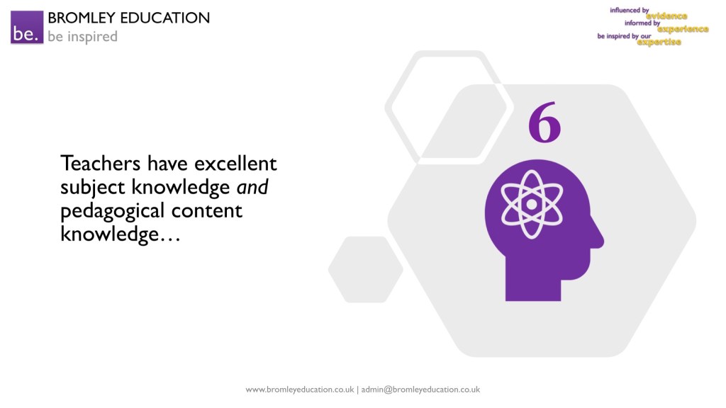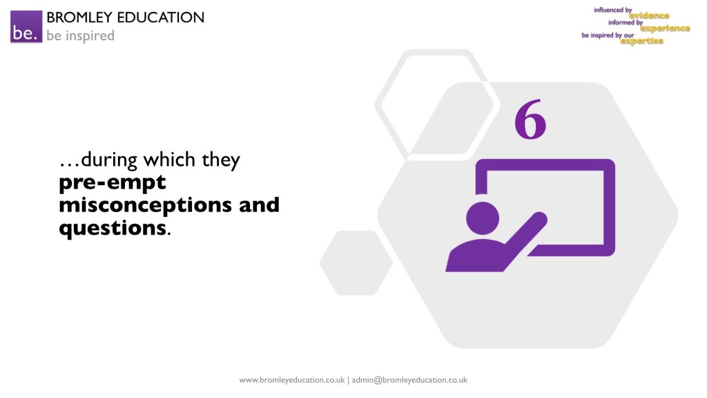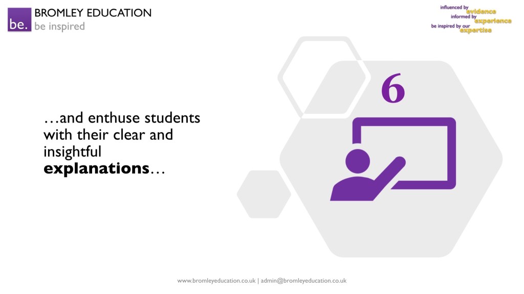 The sixth “coincidence” of expert teaching is that teachers have excellent subject knowledge and excellent pedagogical content knowledge, and they use this to enthuse students with clear and insightful explanations. Teachers pre-empt misconceptions and questions during explanations, too.