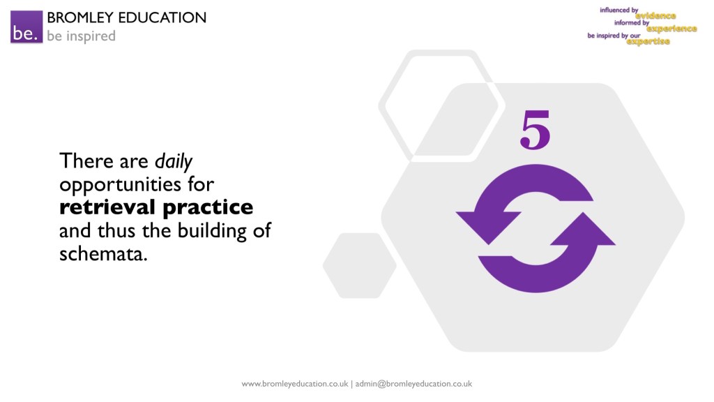 Fifth, with expert teachers, there are opportunities for retrieval practice and thus the building of schema in every lesson. The shape and form of this retrieval practice – and when it happens within the lesson – is dependent on the context, but it happens frequently to prevent knowledge decay and to help students connect prior learning to new learning.