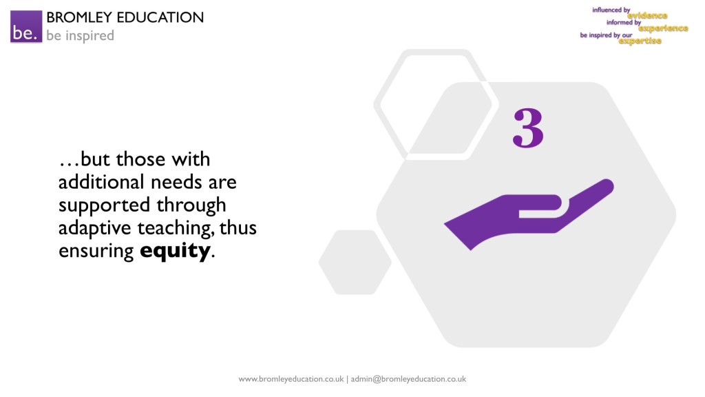 …those with additional needs are supported through adaptive teaching strategies, such as scaffolding, thus ensuring equity. In other words, students who start with less are given more help to access the curriculum and to achieve in line with their peers.