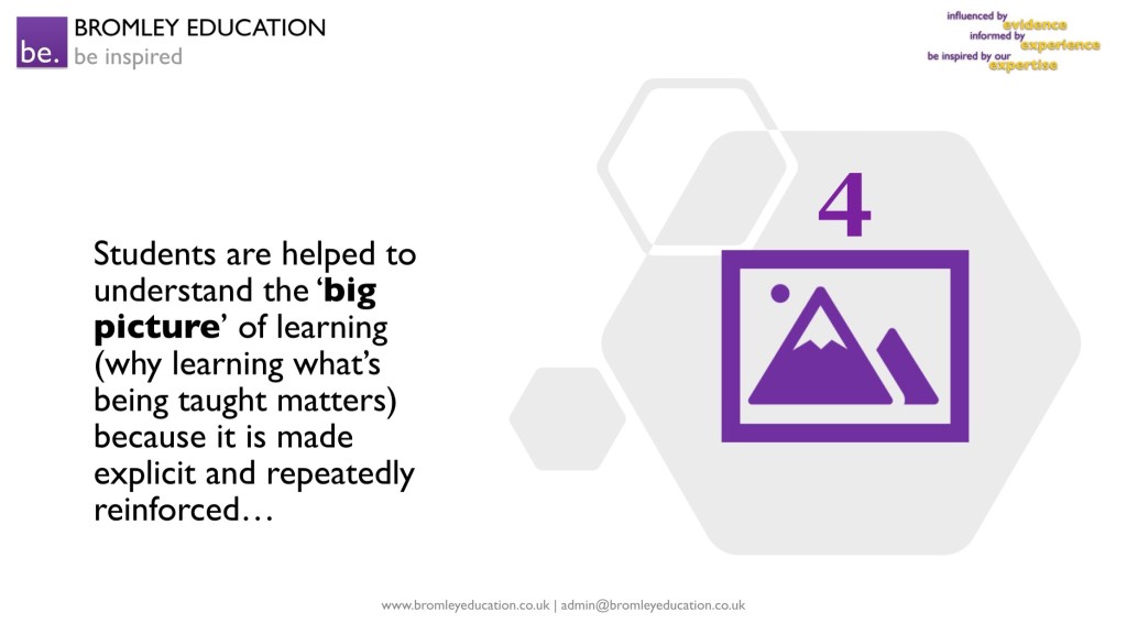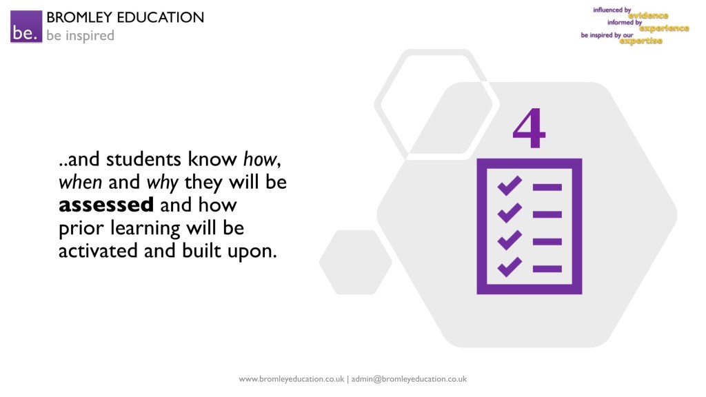 Fourth, as well as knowing the bigger picture of learning, students know how, when and why they will be assessed and how prior learning will be activated and built upon. Students are only assessed when an assessment will lead to feedback, and feedback is only given when there is time carved out in lesson for them to process it, question it, and act upon it. The results of assessments are used as learning opportunities – often in the form of whole class feedback on the most common errors – rather than simply to draw lines in the sand.