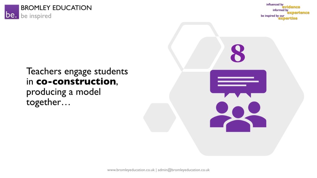 Next, teachers engage the class in co-construction, producing a model together. Students provide the substance while the teacher asks probing questions, drip-feeds technical vocabulary, and passes the baton between students so they can comment on and add to each other’s contributions. Teachers also use questioning effectively to engage students and to provide on-going formative feedback.