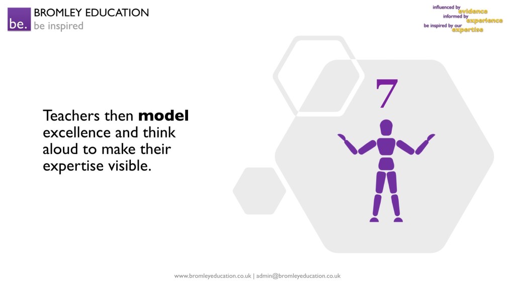 Teachers then model excellence and, while doing so, think aloud – making their invisible thought processes and decision-making visible to students, thus making their implicit expertise explicit to the novice student.