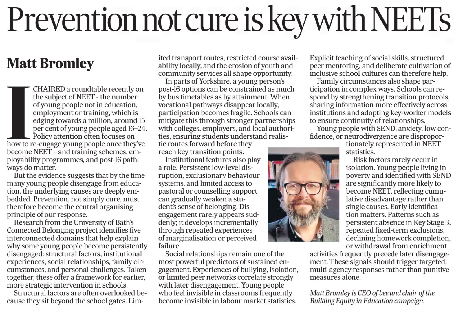 This is an edited version of an article that appeared in The Yorkshire Post on 28 April 2026 in which Matt Bromley argues that prevention is better than cure when it comes to reducing the number of young people not in education, employment, or training…