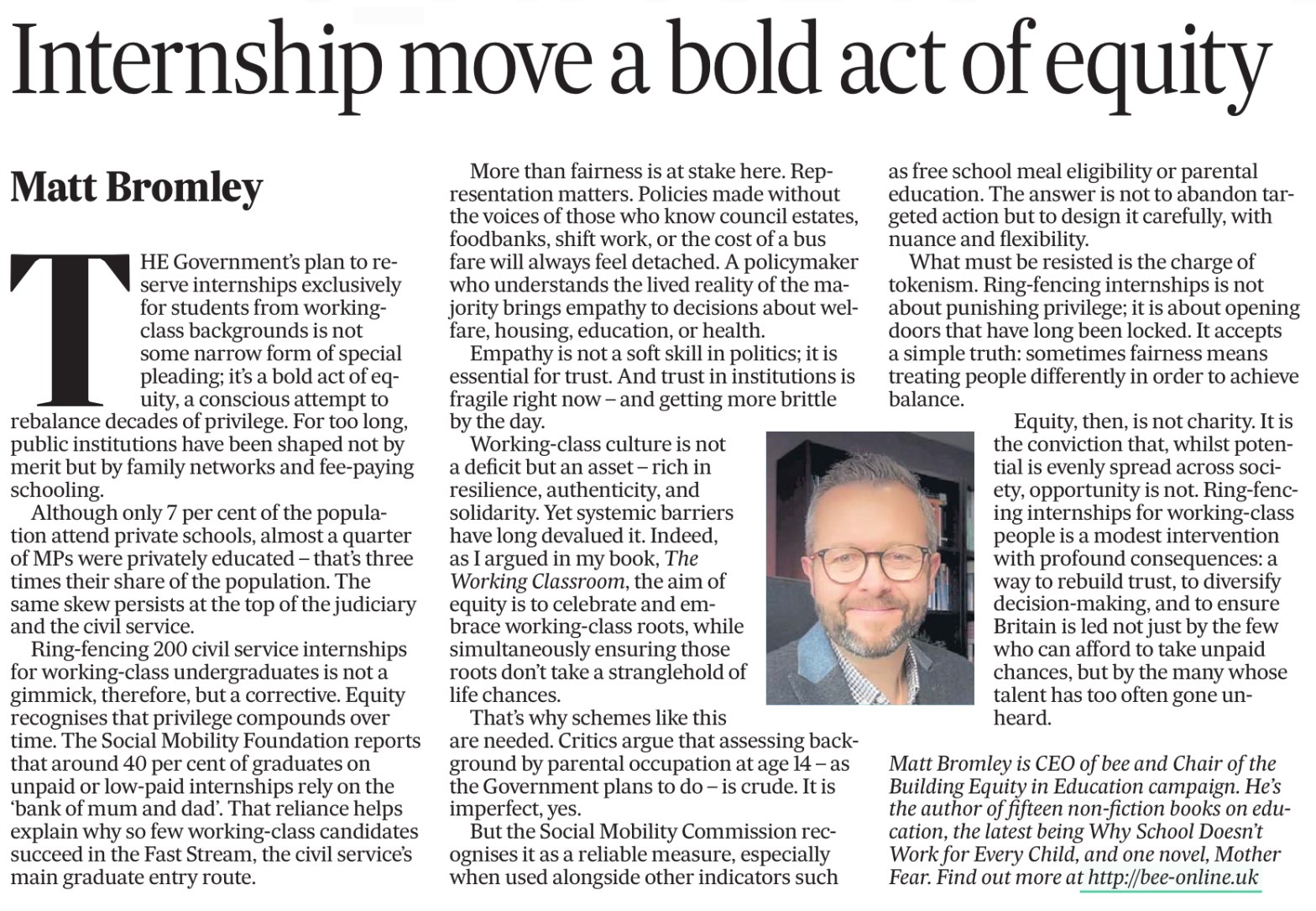 This is an edited version of an article that appeared in The Yorkshire Post on 30 September 2025 in which Matt Bromley argues that the government’s plan to reserve civil service internships for working class people is an essential corrective… The government’s plan to reserve internships exclusively for students from working-class backgrounds is not some narrow formContinue reading “Civil service internships bold act of equity”
