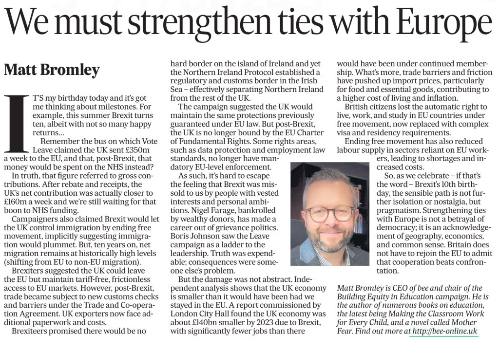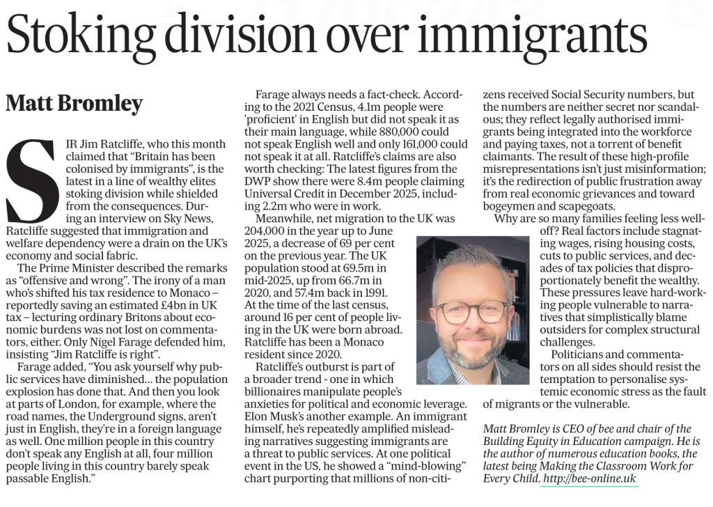 Bogeymen from the billionaire’s playbookWhat Seamus Heaney taught meHappy birthday BrexitBeware the myths of the culture warsPoverty doesn’t pause for ChristmasAccess to the arts is importantTackling inequalities at school is vitalSchool libraries open new worldsMulticulturalism is our way of lifeInternships move a bold act of equityPupils must have a sense of belongingTime to end the six-week summer holidays?EDI are not optional extras in schoolsOur love of a good book is ages oldPupil Premium impact dilutedA system that sees the poor get poorerWhy schools must put the accent on code-switchingSocial justice can close gaps for those left behindTV series shows the need for working class voicesOfsted focus on inclusion welcomeIssues facing minority ethnic pupilsSEND system coming close to breaking pointEvery day in school must matter again