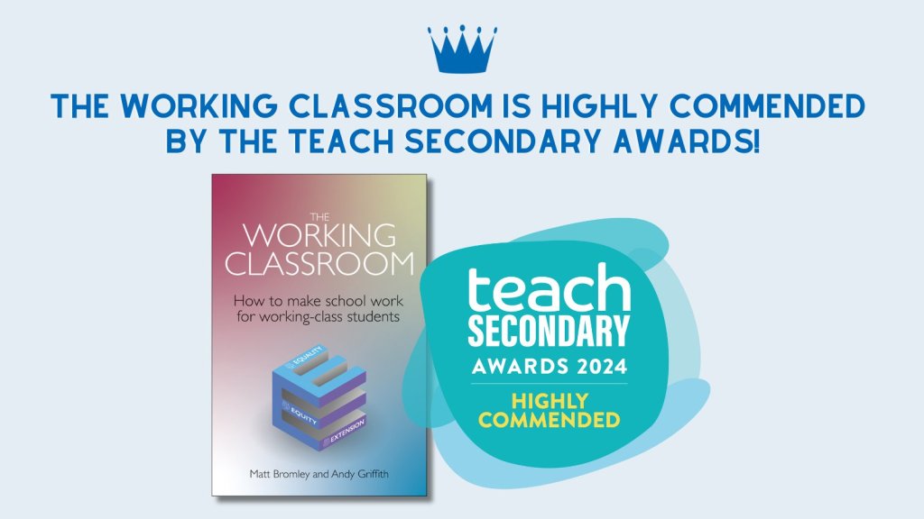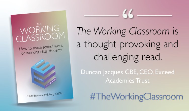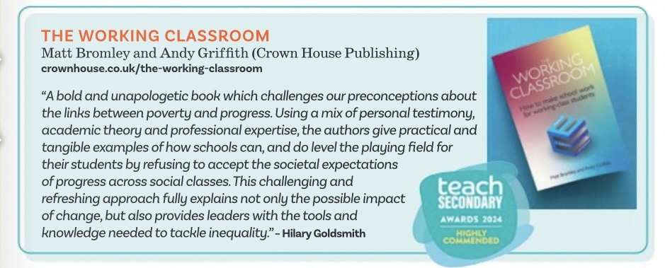 Written by Matt Bromley and Andy Griffith, The Working Classroom: How to make school work for working-class students offers practical strategies and tools to help secondary schools address the needs of working-class students, including by building cultural capital and designing learning that is more engaging to working-class students.
